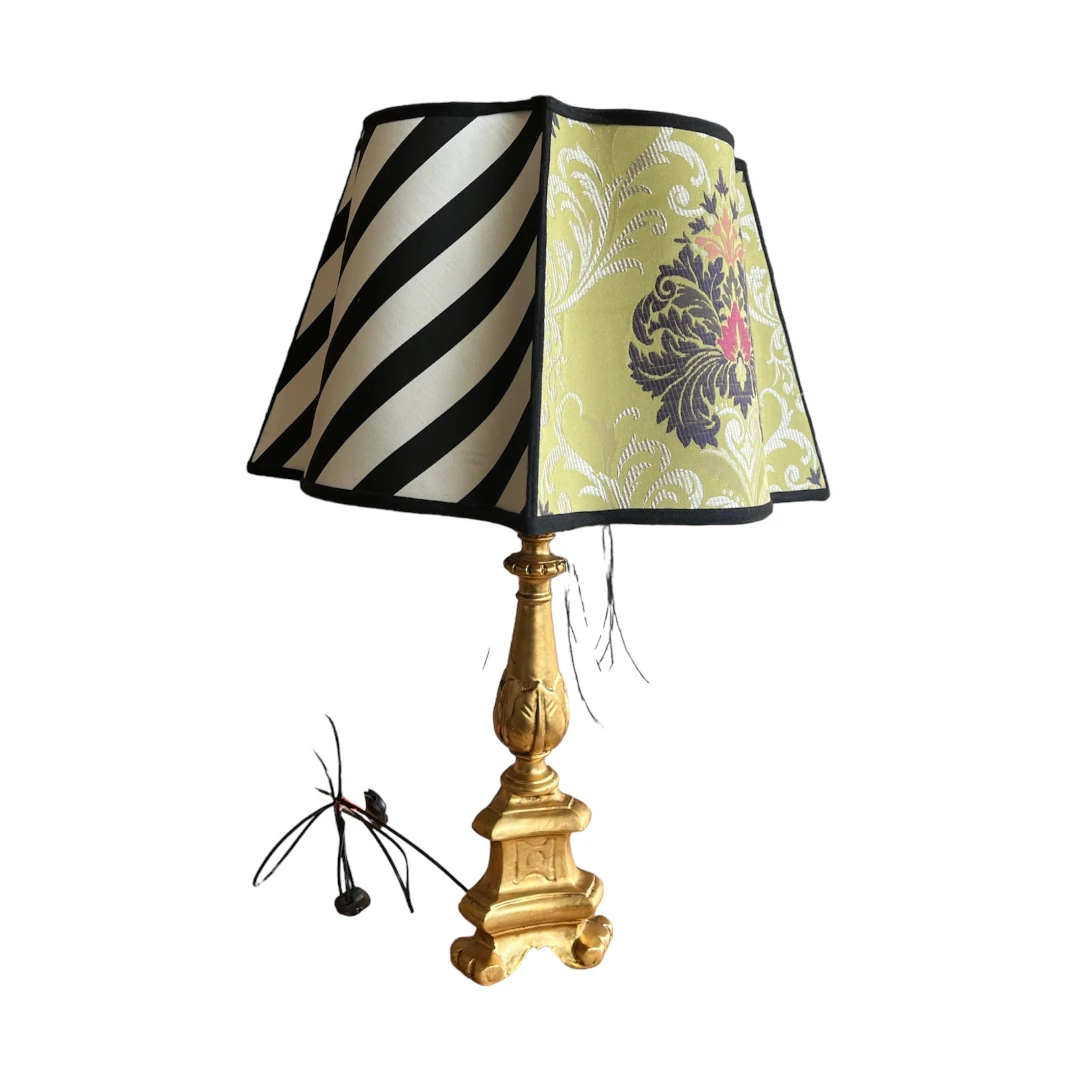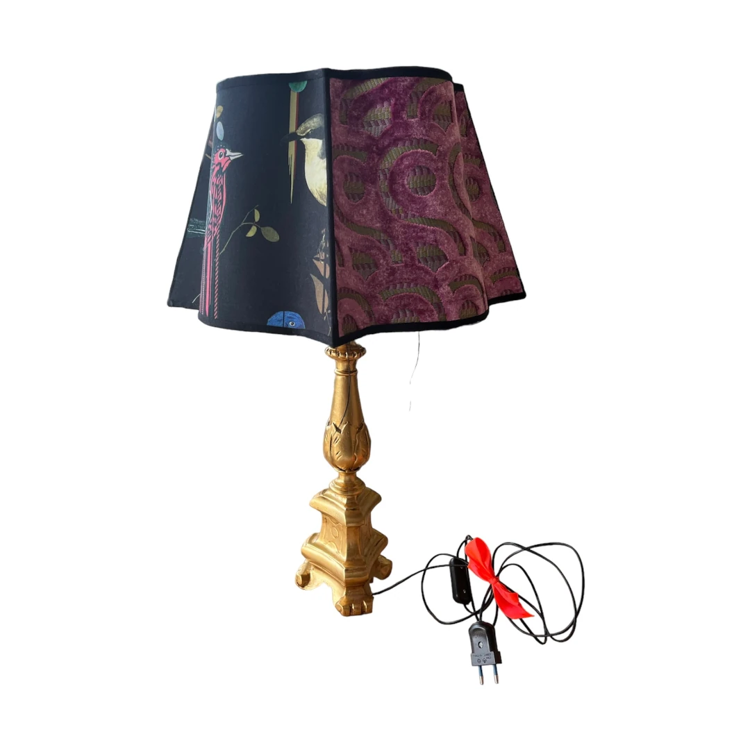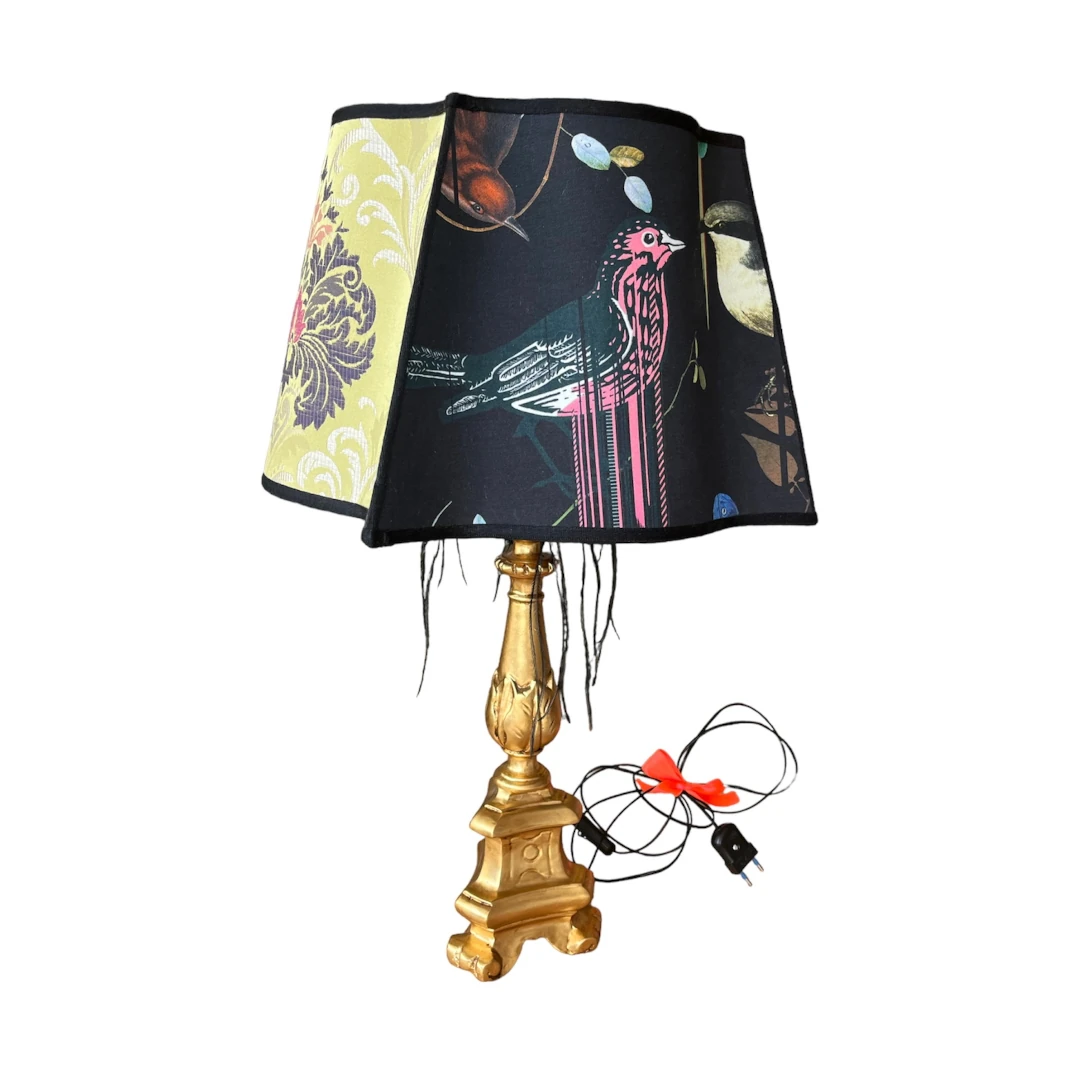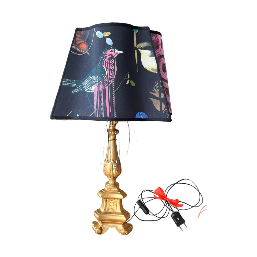 Unica nel suo genere, la Lampada da Tavolo “Bird in Black” unisce funzionalità e arte. Con base in legno massello, cappello quattro lati, tessuti esclusivi e rifiniture nere, aggiunge eleganza a qualsiasi ambiente. Il colore foglia oro caldo e la stampa poliestere si adattano sia al classico che al moderno. Altezza: base 40 cm, cappello 26 cm, larghezza 40 cm. Potenza 100W. Perfetta per illuminare e abbellire casa, ufficio o albergo. Accensione tramite pulsante.