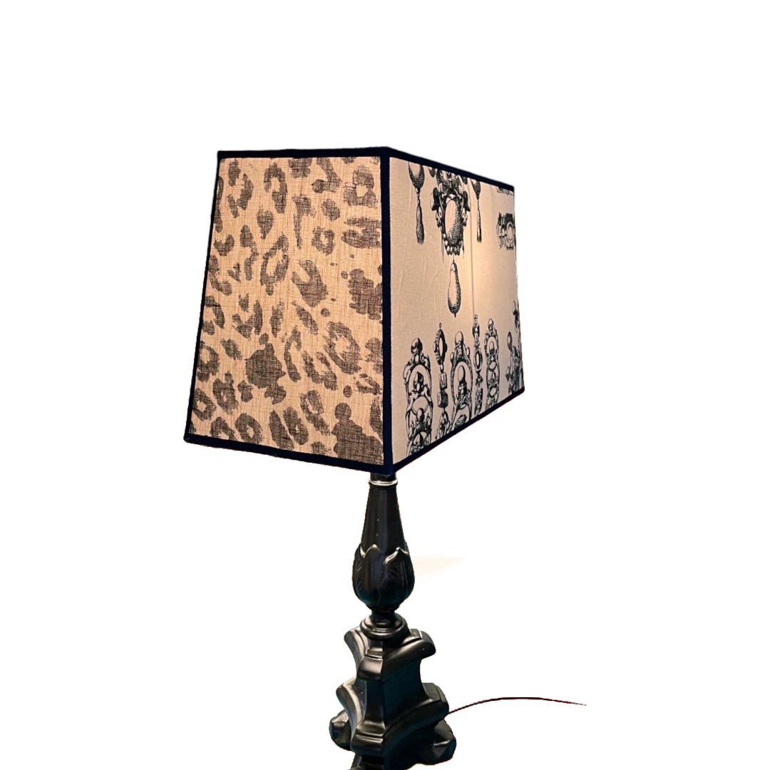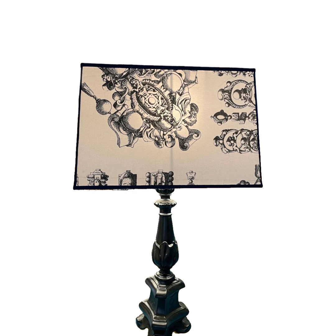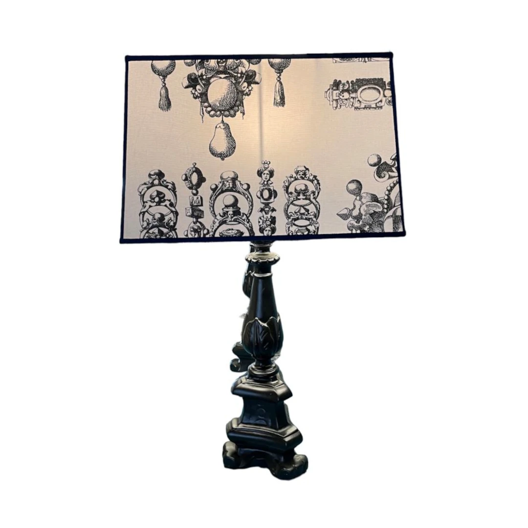 Unica nel suo genere, la Lampada da Tavolo “Lacroix in WHite” unisce funzionalità e arte. Con base in legno massello, cappello quattro lati, tessuti esclusivi e rifiniture nere, aggiunge eleganza a qualsiasi ambiente. Il colore nero opaco e la stampa black and white si adattano sia al classico che al moderno. Altezza base 49 cm, altezza cappello 42 cm, larghezza 20 cm. Potenza 100W. Perfetta per illuminare e abbellire casa, ufficio o albergo. Accensione tramite pulsante.