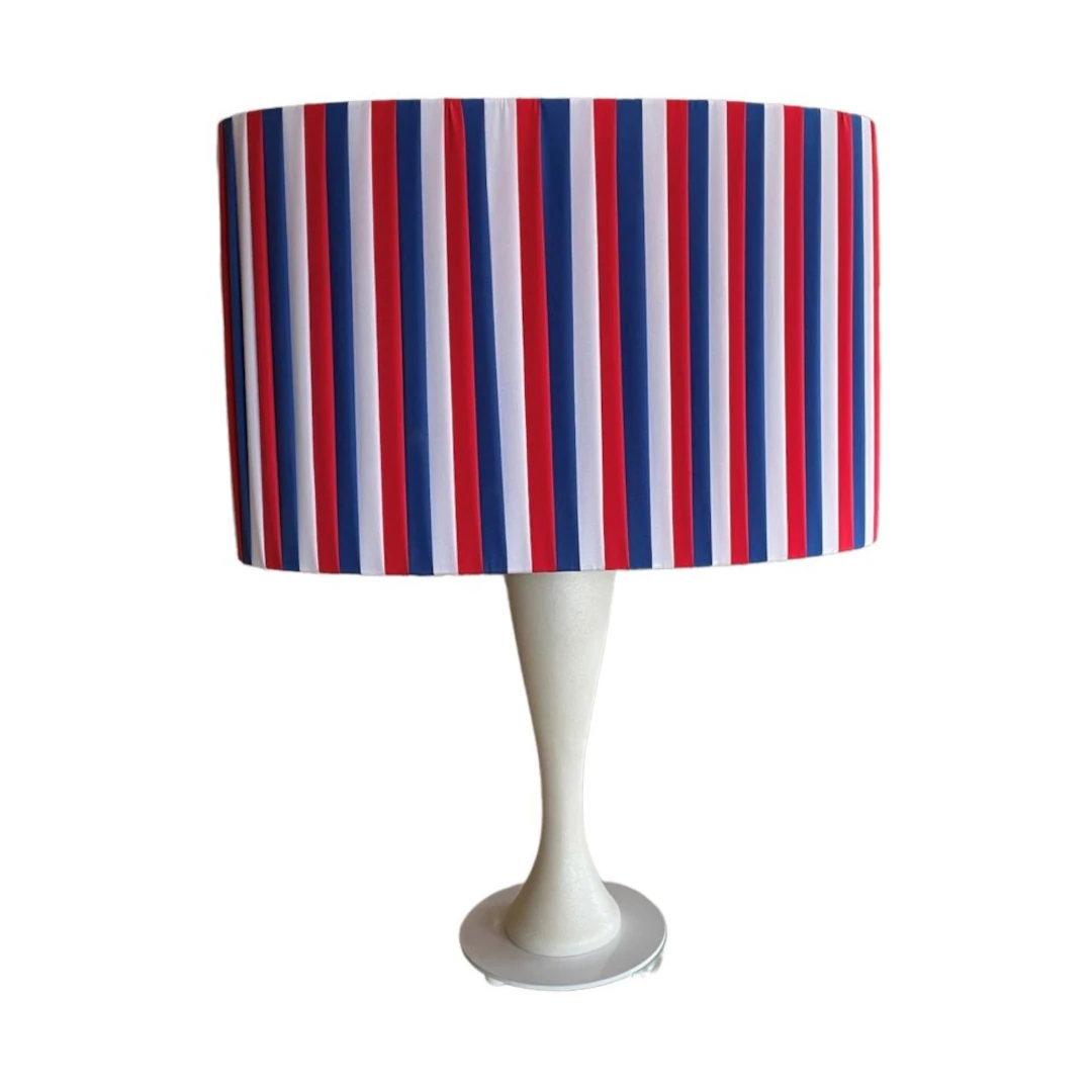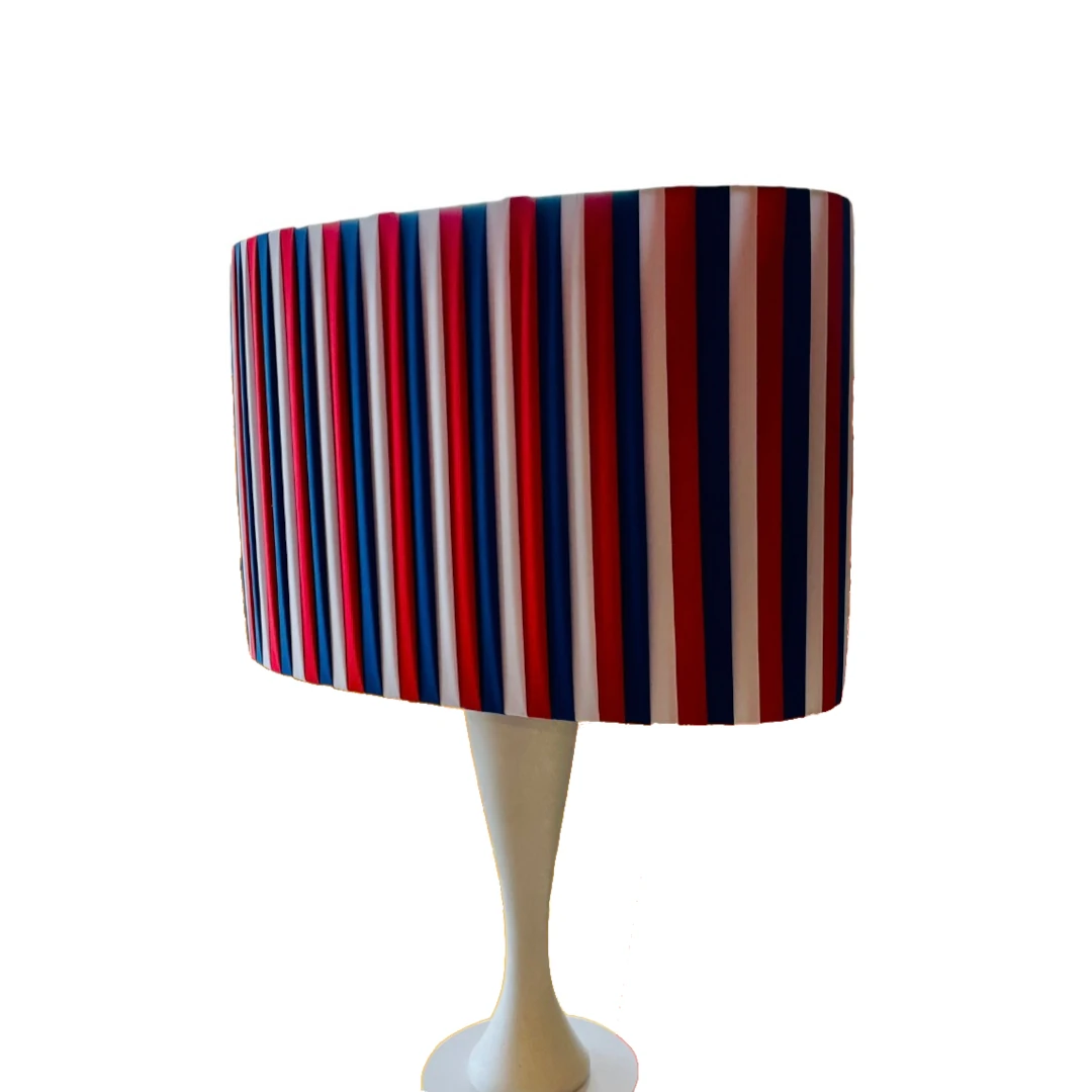 Unica nel suo genere, la Lampada da Tavolo “Multistripe” unisce funzionalità e arte. Con base in acciaio Inox 3mm ,stelo in legno massello, cappello ovale, tessuto esclusivo, aggiunge eleganza a qualsiasi ambiente. Il colore avorio opaco della base, il cappello rivestito con intreccio manuale di tulle avneti tre colori rosso,blu elettrico e bianco, rende questa lampada adatta sia al classico che al moderno. Altezza base 33 cm, altezza cappello 23 cm, larghezza totale 46 cm. Potenza 100W. Perfetta per illuminare e abbellire casa, ufficio o albergo. Accensione tramite pulsante.