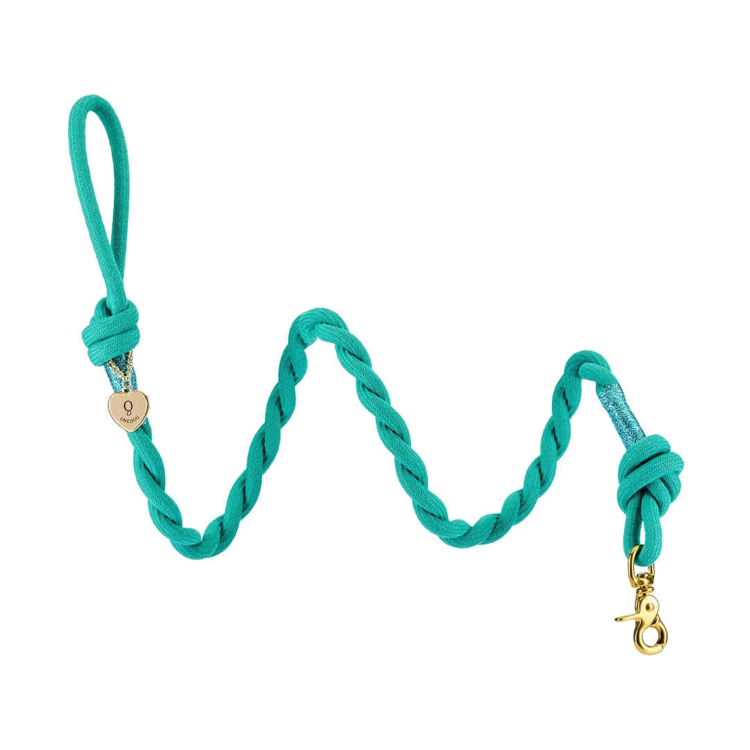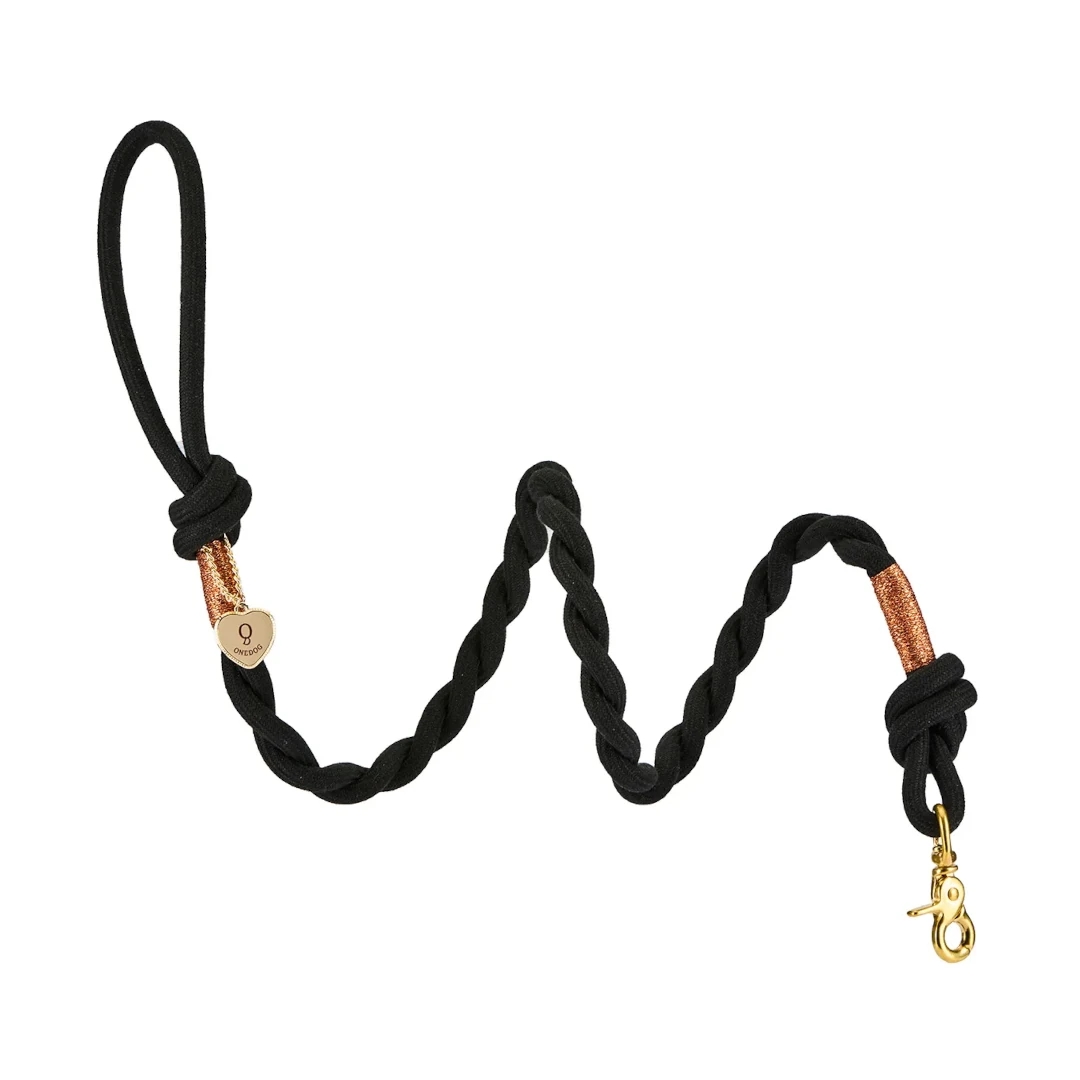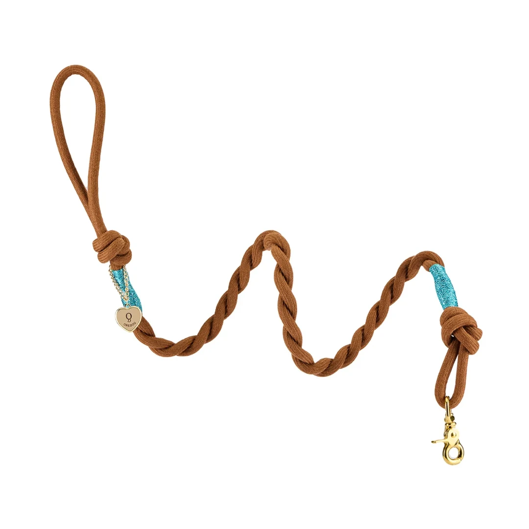 Raffinata corda intrecciata a mano e rifinita con filo di glitter e medaglietta ONE DOG. Affascina con i suoi colori caldi e eleganti. Guinzaglio adatto a qualsiasi situazione perché molto robusto e resistente.